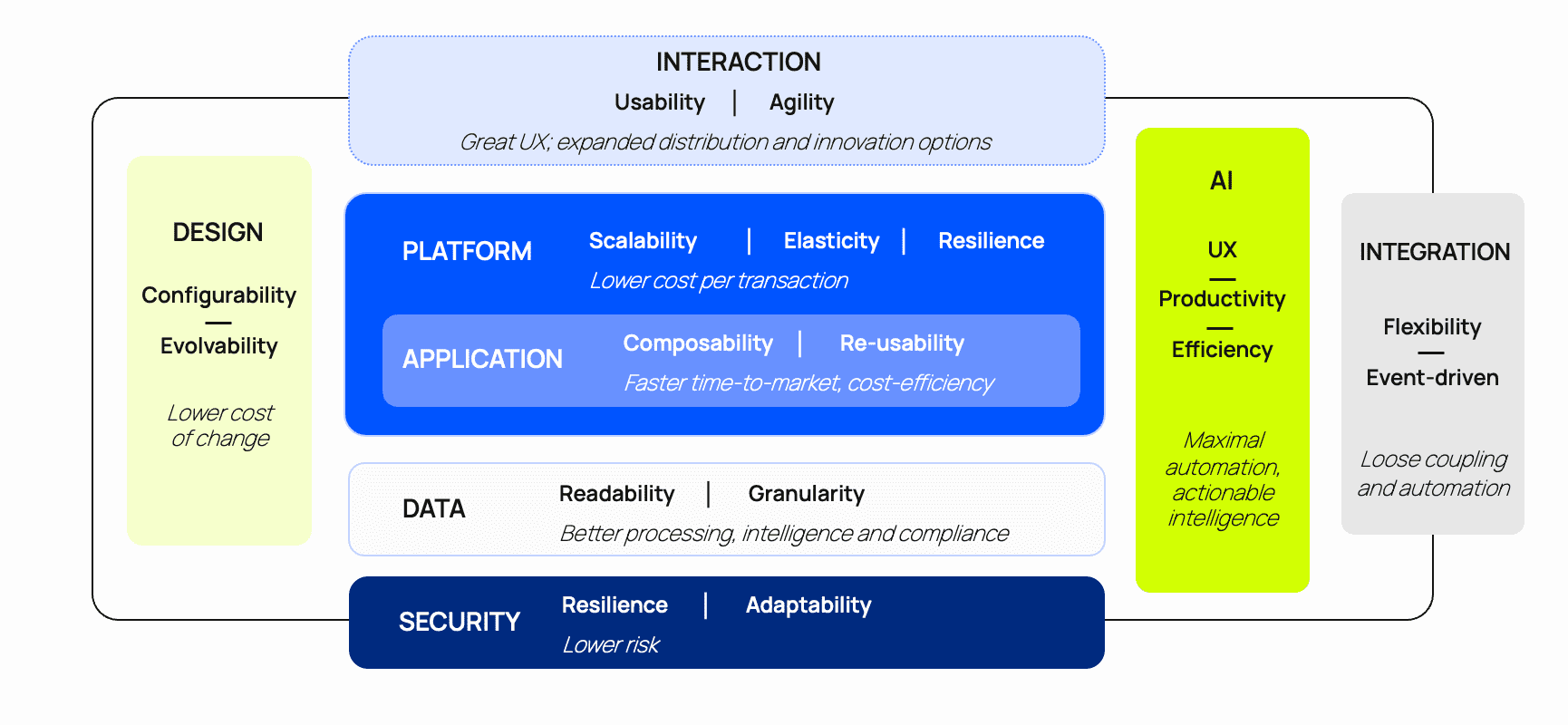 To ensure competitive agility and minimize the cost of running and evolving the bank, the platform’s seamlessly integrated yet independently evolving layers are structured around eight enterprise-grade frameworks, covering Design, Interaction, Platform, Application, Data, Integration, Security, and AI.